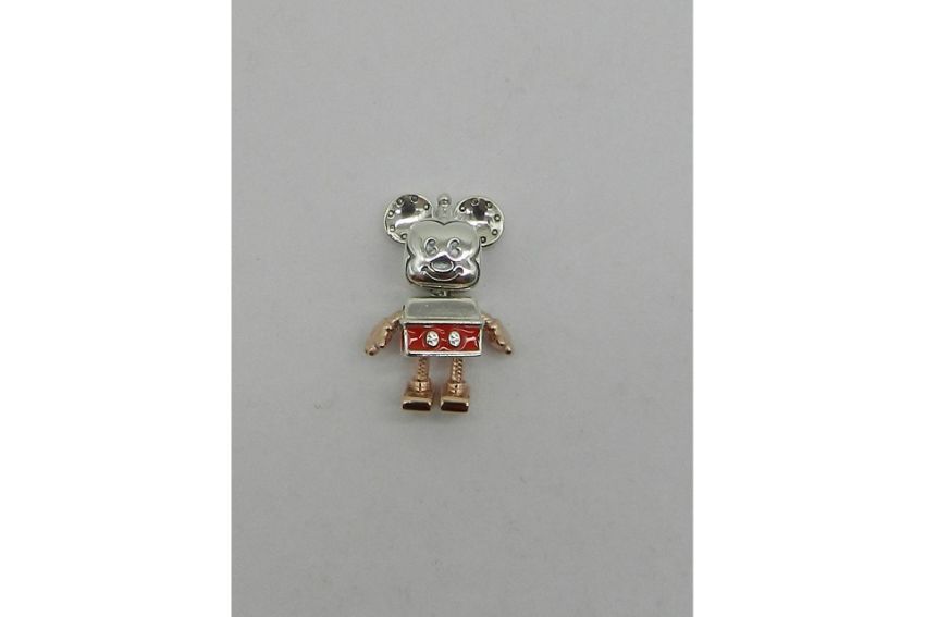 Pandora Disney Mickey Robot charm. A moveable design that reimagines the lovable character with robot-like features - sterling silver body, Pandora Rose arms and legs in a snake chain texture, screw like details on the ears, antenna on the head and red enamel shorts. Dimensions: Depth - 7.5mm, Height - 20mm, Width - 13.4mm