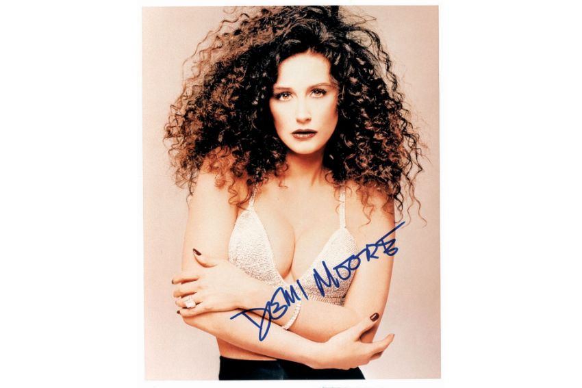 A colour photograph of the US film actress Demi Moore, who has signed across her image in bold blue ink.