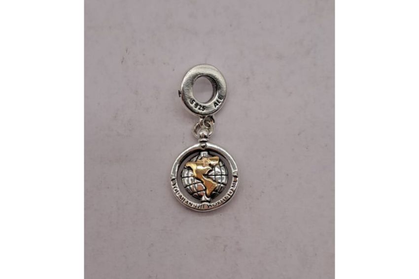 Pandora spinning world charm. Dangle charm featuring a flat spinning globe inside a round frame with a sparkling stone on the bail, engraved longitude and latitude lines, the globes continents hand-finished in 14k gold and the frame decorated with small lifted hearts and the engraving 'You mean the world to me' on the front and the Pandora logo on the back. Metal: Sterling Silver and 14k Gold. Dimensions: Depth 3.5mm, Height 15.3mm, Width 12.7mm