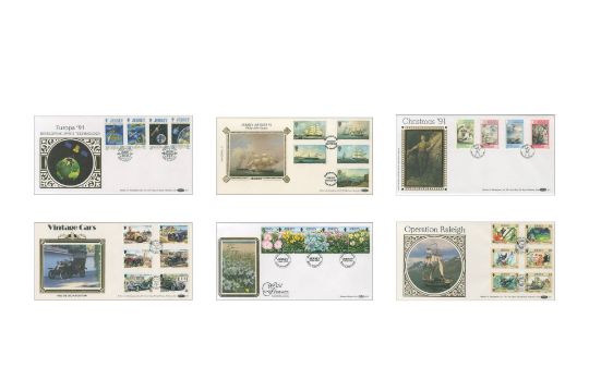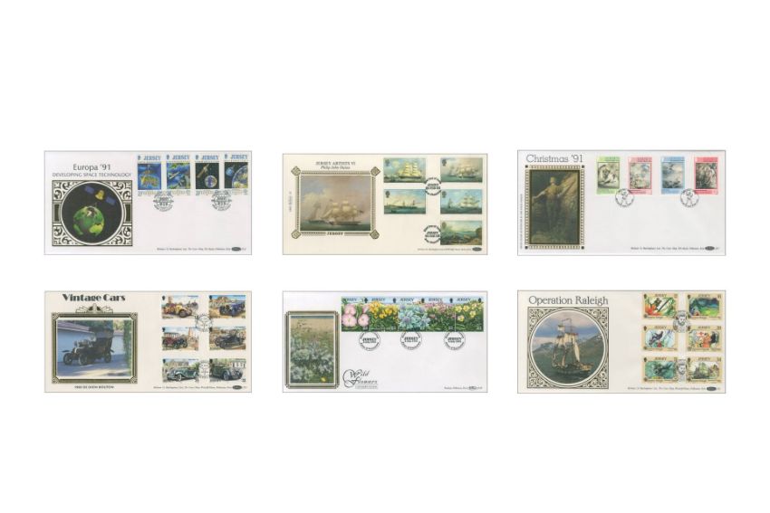 A colourful selection of Benham Jersey first day covers, each featuring a fantastic variety of different images and stamps of the beloved Channel Isle.