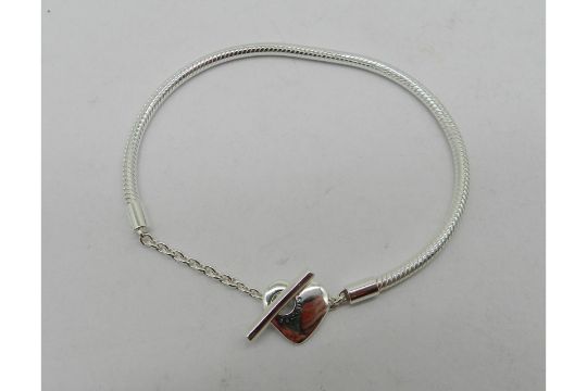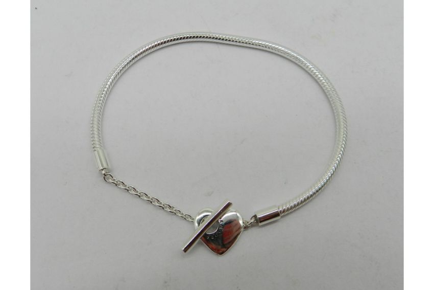 Pandora Moments heart t-bar snake chain bracelet. This features a heart-shaped disc with an open circle on one side to loop the t-bar through to open and close and with the Pandora logo engraved. The bracelet is in the classic snake chain meaning around 10-13 charms can be styled on it. Metal: Sterling Silver. Dimensions: Depth 4.65mm, Height 17.5mm, Width 13.5mm. Size 21cm
