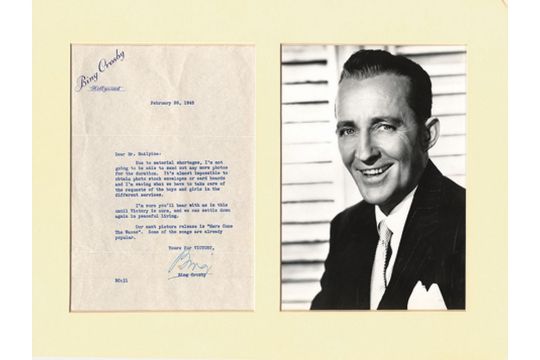 Typed letter signed by Bing Crosby along side a Black and White photo. Size: Photo 175 x 225 mm Letter Size:185 x 265mm