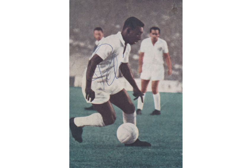 A colour photo from a football magazine or similar of the legendary Brazilian footballer Pele, pictured in action. Signed in blue ink.