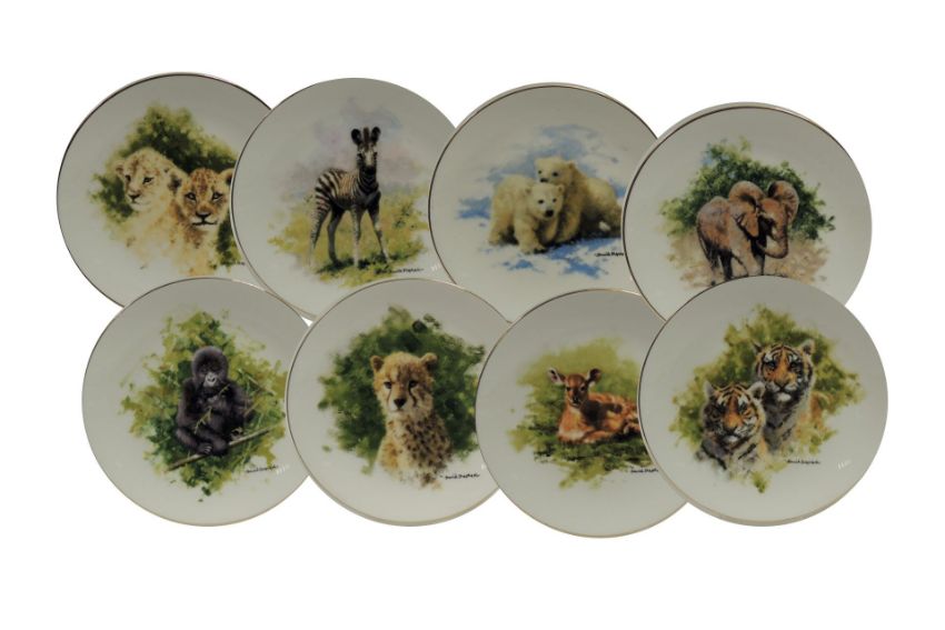 A collection of eight plates featuring the art of David Shepherd. Each plate pictures a different animal: Lions; Zebra; Polar Bears; Gorilla; Cheetah; Nyala; Elephant and Tiger. Ceramic plates, measure: 17 x 17 x 2cm