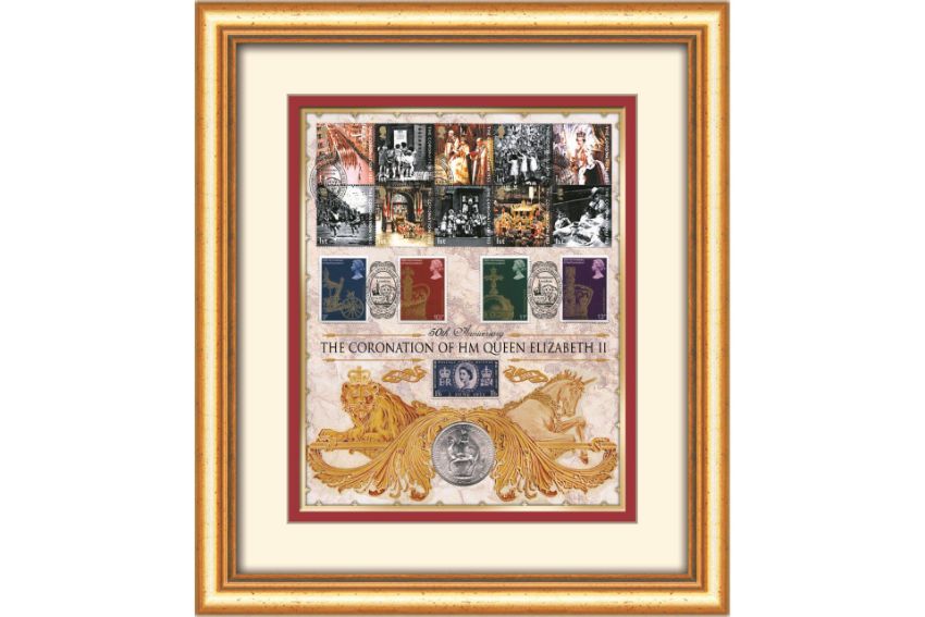 Superb 2003 coin cover commemorating the 50th anniversary of the coronation. Original 1953 crown and 1/6d postage stamp. Framed limited edition of 30. Size: 320 x 360mm