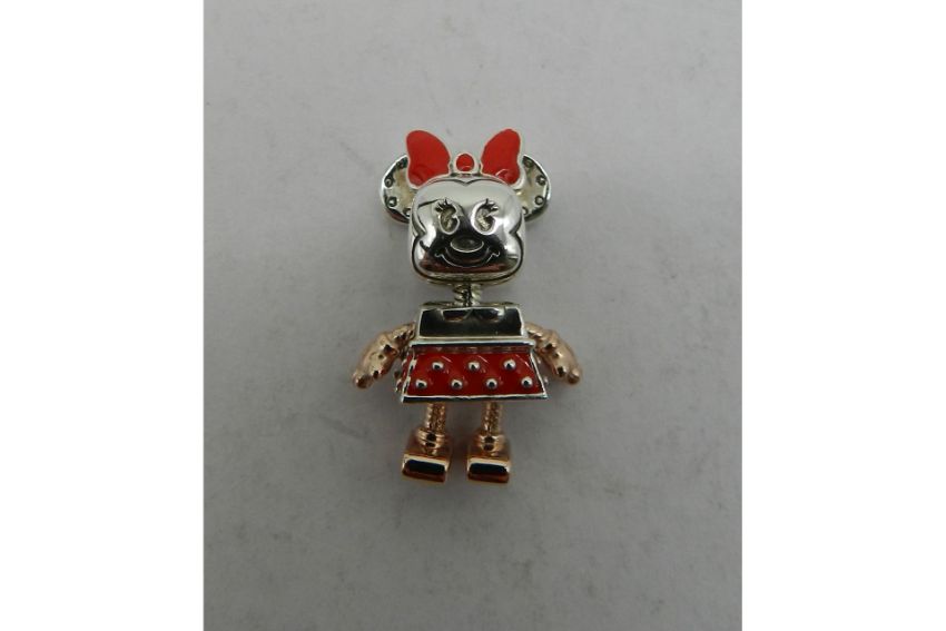 Pandora Disney Minnie Robot charm. A moveable design that reimagines the lovable character with robot-like features - sterling silver body, Pandora Rose arms and legs in snake chain, screw-like details on the ears, antenna and a red enamel skirt and bow on the head. Metal: Sterling Silver and 14k Rose Gold-plated. Dimensions: Depth 7.5mm, Height 22mm, Width 13.2mm.