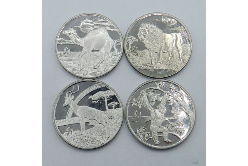 A quartet of Sierra Leone 'wildlife' thematic Crowns. Coins include: Lion; Chimp; Impala and Camel