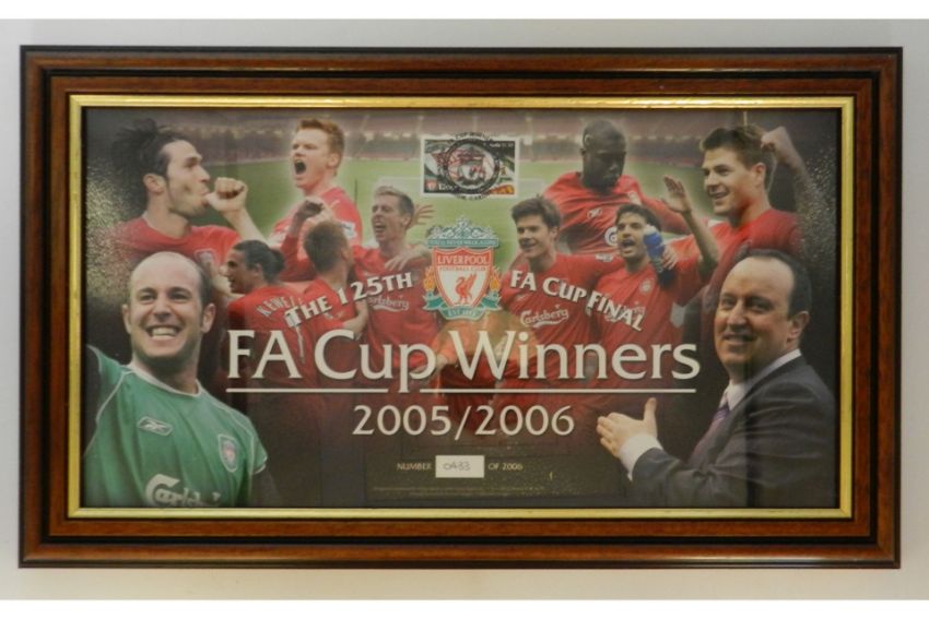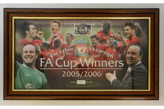 One of the most entertaining FA Cup finals ever seen ended with The Reds lifting the trophy for the seventh time after a tense penalty shoot-out against West Ham. Officially endorsed by Liverpool FC, this framed commemorative features images of the players and manager together with a Liverpool postage stamp and special cachet with the date of the final. Numbered, limited edition of only 2006 in a wood frame measuring 320 x 250 mm with Certificate of Authenticity on reverse.