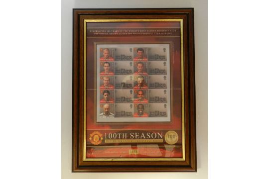Framed stamp sheet celebrating Manchester United's 100th season. The sheet bears 10 first class stamps with labels picturing Manchester United's present-day heroes.