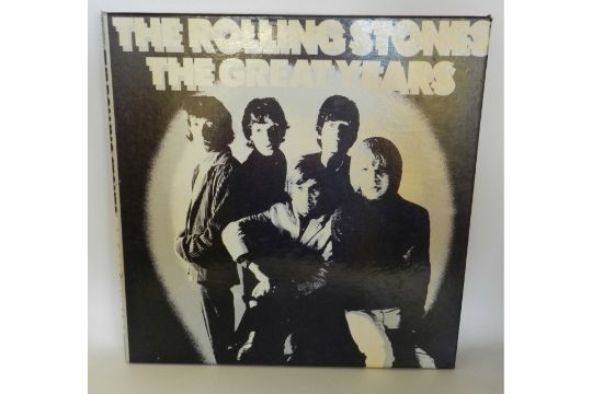 A collection of Rolling Stones vinyl, including four records each housed in its own sleeve within the box. Over 60 tracks across all four vinyl.