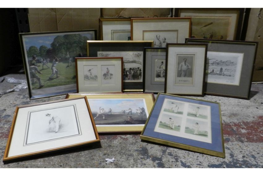 Twelve vintage framed and glazed cricket themed prints