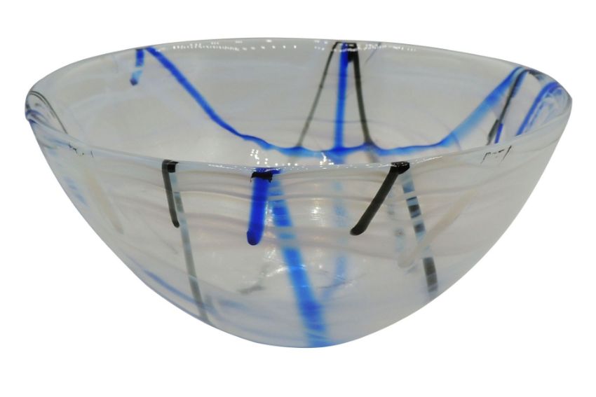 Hand-applied decoration of swirls of color and contrasting calligraphic lines make each Contrast Bowl a unique work of art. The pure forms are crystal arenas for the drama of free-flowing patterns that bring out the inner nature of the glass.The designer is Anna Ehrner. The bowl stands 125mm tall, diameter 230mm