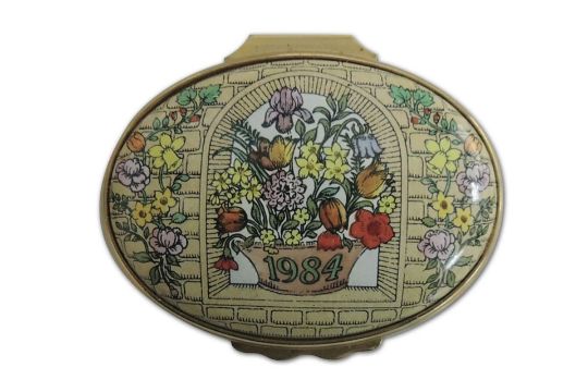 Halcyon Days 1984 A Year to Remember enamel box. Hinged lid. Measures 55mm x 40mm x 25mm high. Comes in original box.