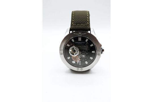 Brushed stainless steel. Multi-layered dial with black, white and rose gold coloured dials and mirror finish open hour and minute hands. Canvas green strap.  Limited edition of 500. CASE: Housing Colour: Silver; Case Material: Stainless Steel; Glass Type: Sapphire glass; Water Resistance: 10 ATM. X13-S07-BS. New with authenticity card