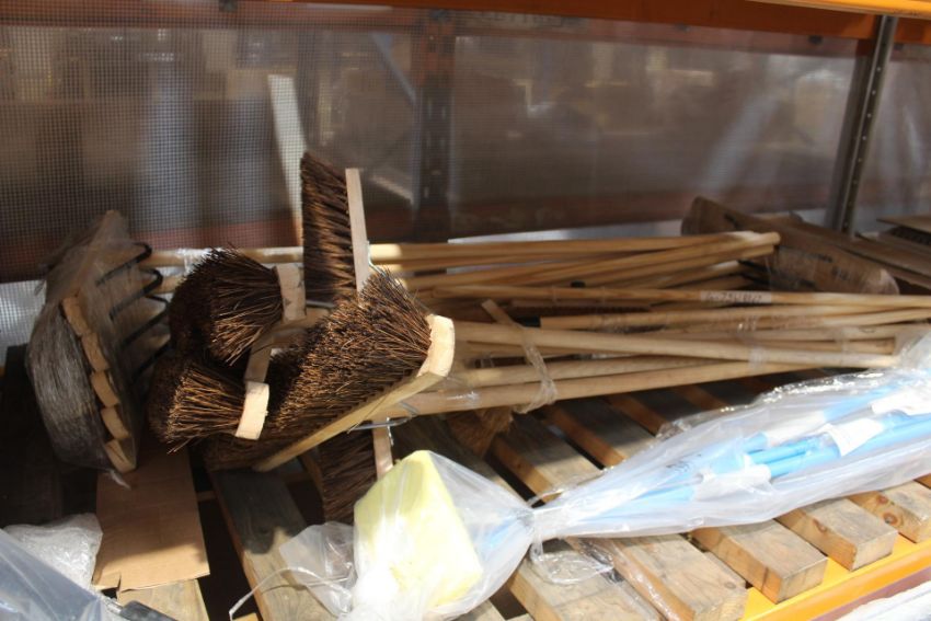 Fifteen Long Handle Brooms and Three Robert Scott Wonderdry Squeezy Sponge Mops.