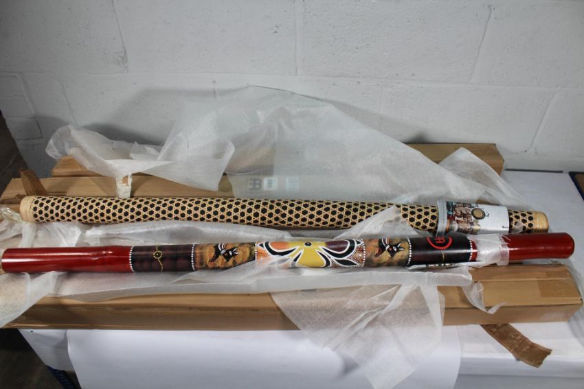 Three Meinl 47" Pro Rainsticks - Rattan Wrapped Bamboo, one XXL - Black and two Hand-Painted Didgeridoos, 47" Wood, Red, all as new.