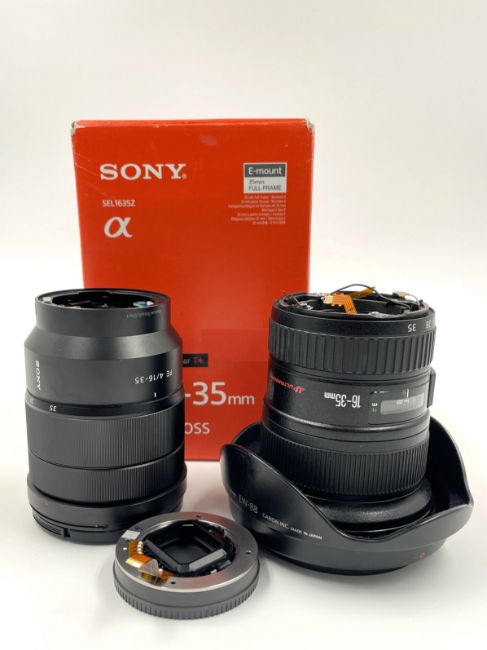 Two pre-owned lenses sold for parts; 1 x Sony Vario-Tessar T* FE 16-35mm f/4 ZA OSS Lens and 1 x Canon EF 16-35mm f/2.8L II USM Lens (Sold as seen for spares or repair).