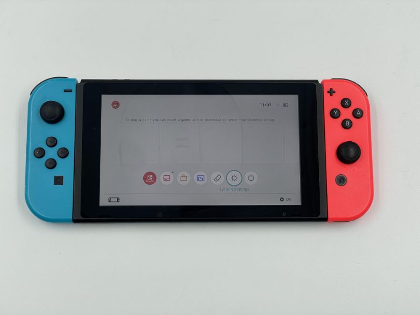 A pre-owned Nintendo Switch Console (HAC-001-01) 32GB with Neon Blue/Red Joy-Con Controllers (No charger, game cards or other items included).