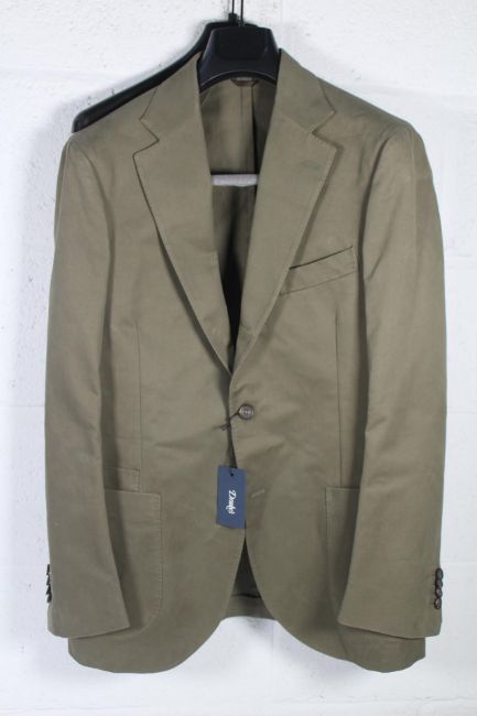 An as new Drakes Lovat Cotton Drill Tailored Jacket, Made in Italy, Size 42 (Measurements; Chest 55cm, Shoulder to Shoulder 49cm, Overarm Sleeve Length 65.5cm, Centre Back Length 77cm).
