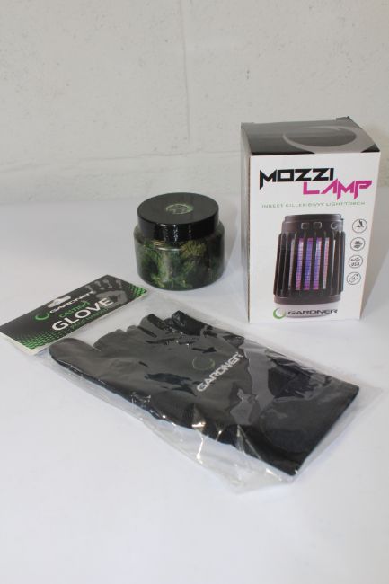 Five Mozzi Lamps, Five Casting Gloves and Ten Camo Plastic Pots, All Gardner.