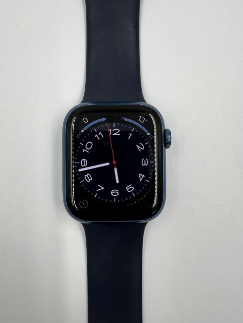 A pre-owned Apple Watch Series 7 45mm in Blue Aluminium with Navy Blue Sports Band (M/N: MKN83B/A) (iCloud account clear).