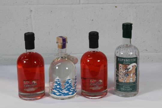 Two Black Bridge Fruit Pudding & Cranberry Gin Liqueur 2 x 700ml, M & S Spiced Sugar Plum Gin Liqueur 700ml, Sipsmith London Dry Gin.