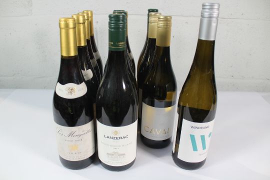 Five Les Mougeottes Pinot Noir 2021 Pays d’Oc (13%), Four Lanzerac Sauvignon Blanc (14%), Two Cavalli Unoaked Chenin Blanc 2022 (13.5%) and One Windfang Rheinhessen Pinot Blanc 2021 (12.5%), all 750ml.