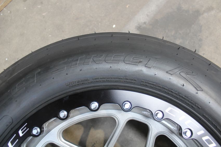 Two Cicio Performance Drag Wheels for a Nissan R35 GTR with Mickey Thompson E.T Street R Tyres.
