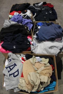 Five boxes full of assorted pre-owned clothing to include Adidas, Le Coq Sportif and Puma.