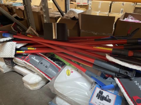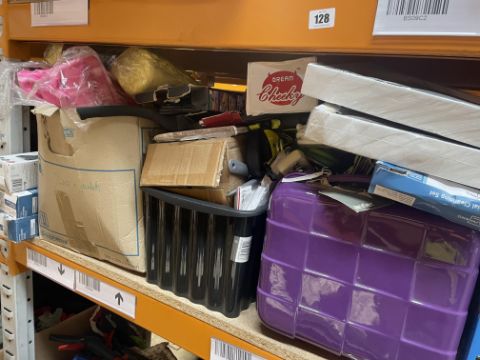 Three Shelves of assorted Homeware & Kitchen Items, including Pots, Pans, Mops, Bins and many more.