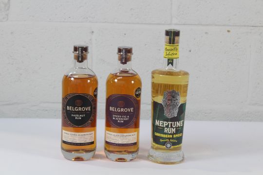 Belgrove Small Batch Hazelnut Rum 700ml, Belgrove Small Batch Spiced Fig & Blackberry Rum 700ml and a Neptune Caribbean Spiced Speciality Infusion Papaya & Damiana, Vanilla & Cinnamon Rum 700ml.