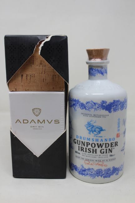Drumshanbo Gunpowder Irish Gin Ceramic Bottle (43%, 700ml) and Adamus Organic Dry Gin (44.4%, 700ml, box damaged).