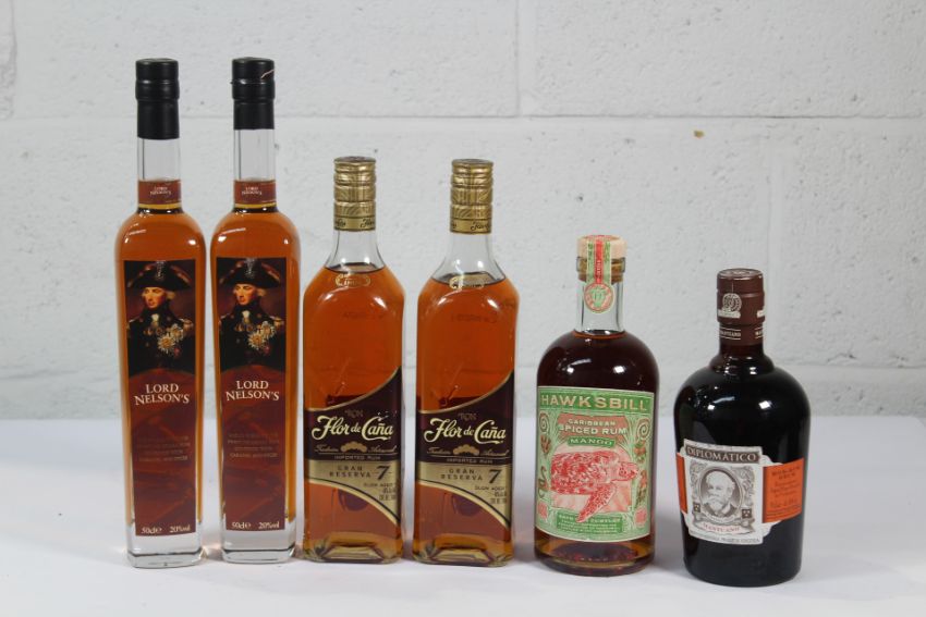 Two Flor De Cana Gran Reserve 7 Slow Aged Imported Rum 2 x 700ml, Hawksbill Caribbean Mango Spiced Rum 700ml, Two Lord Nelson Spiced Rum Liqueur 2 x 500ml, Diplomatico Mantuano Premium Dark Rum 700ml.