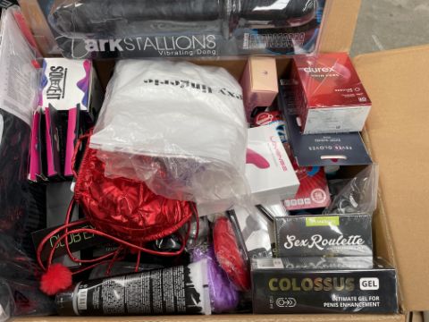 Fifty items of Assorted Adult Toys, Supplements, Condoms and Related to include a Dark Stallion Vibrating Dong, Colossus Gel, Lovense Ambi and Durex Surprise Mix (Over 18s only).