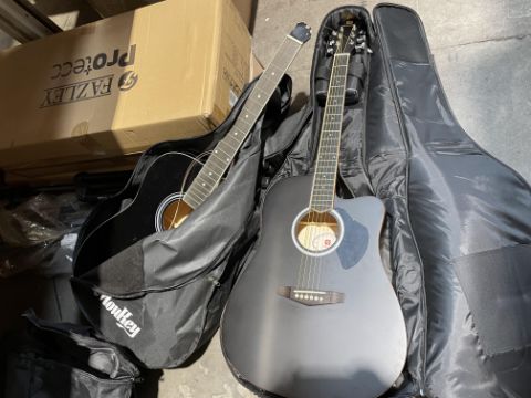 Assorted Audio, Musical and Stage Related Items to include Boss Distortion DS1, Samson MDA and Flashback Guitar Pedals, a Vangoa Acoustic/Electric Guitar (all pre-owned), Fame Guitar Cables and a VOX amPlug 2 Cabinet.
