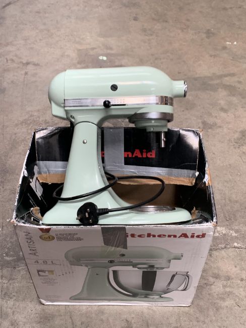 A Kitchen Aid Artisan 4.8 L Mixer in Pistachio (UK Plug). Pre-owned, item may be incomplete.