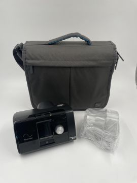 A pre-owned ResMed AirSense 10 AutoSet CPAP Machine with power adapter, tubing & water unit in padded carry bag.