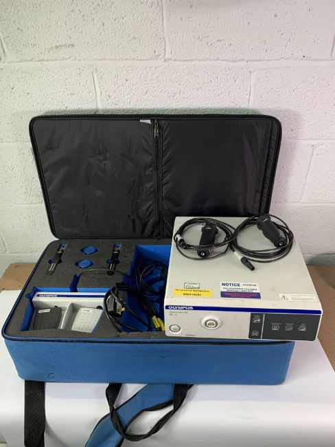 An Olympus EGSPL-SR (SPL-G) ShockPulse SE Lithotripsy System. Comes with power cable, two SPL-T Handheld Transducers, two SPL-NC Nose Cones, two SPLT-W Torque Wrenches and a SPL-FS Foot Switch. Item is Pre-owned. Item powers on but has not been tested further.