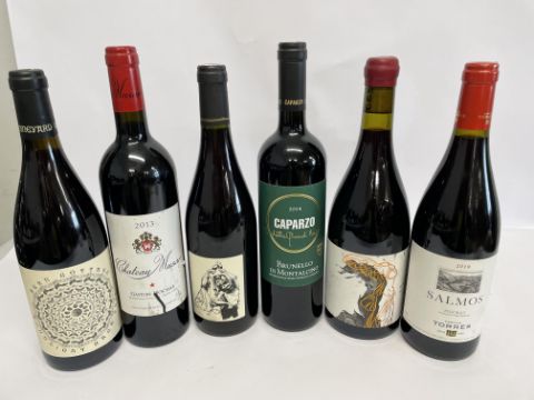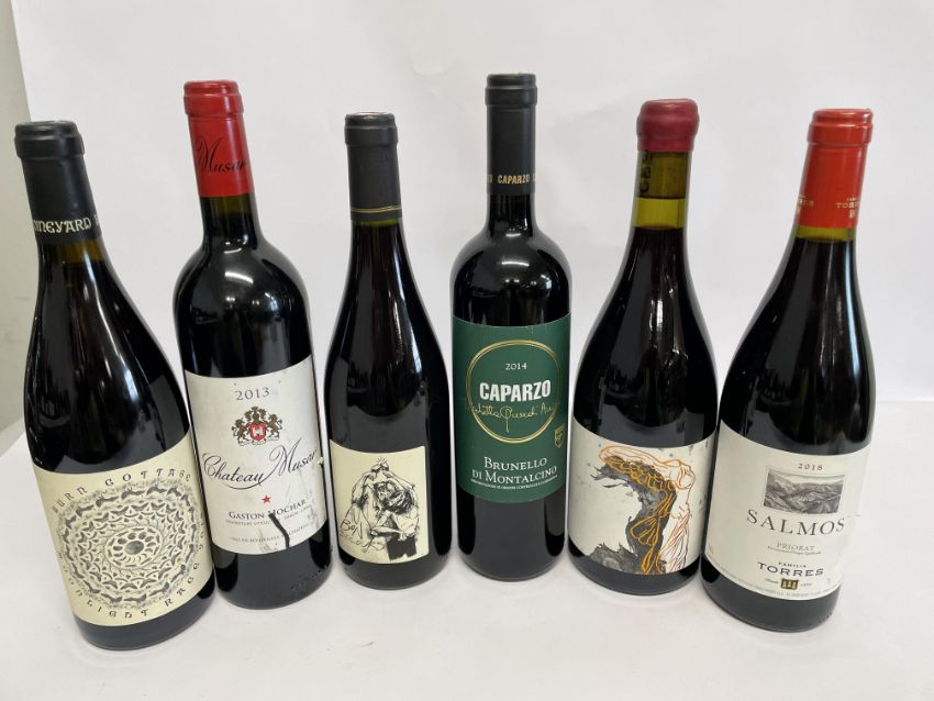 Six red wines: Caparzo Brunello di Montalcino 2014 (13.5%), Au Bon Secours (11%), Antiqua Obergo 2016 (14.5%), Chateau Musar 2013 (14%), Burn Cottage Moonlight Race 2016 (13%) and Salmos Priorat 2018 (14%) - 750ml.