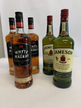 Two Jameson Triple Distilled Irish Whiskey 2 x 1ltr, Three Whyte & Mackay Blended Scotch Whisky 3 x 1ltr.