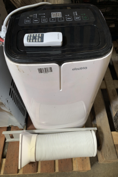 Electriq Air Conditioner Unit, White, Comes with Remote And Ventilation Pipe. Damaged Plastic. (Powers On, Not Tested Further, Sold As Seen).