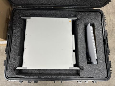 Pre-owned Fluke 5502A Multi-Product Calibrator with various cables, manual, calibration certificates in a wheeled flight case (Calibration required. Rattling sound when moved, possible loose/damaged component. Powers on, not tested further. Sold as seen).