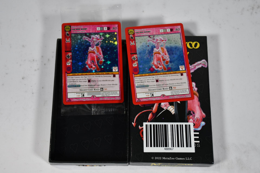 A MetaZoo Box containing two The Red Ghost holographic playing cards.