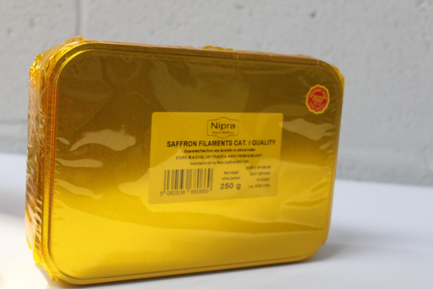A Nipra 250g tin of Saffron Filaments Cat . I Quality packing year 2022 campaign 2021 - 2022 (BB 31/12/2025) (Tin Dented).