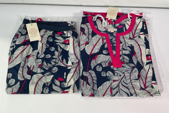 Three women's Inara Indian Cotton Leaf Print Pyjama Sets - S, L and XL.
