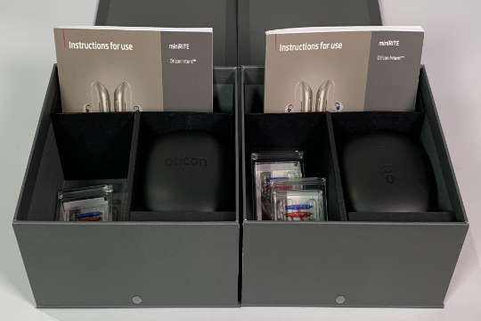 Two boxes of Oticon Intent 3 Minirite Hearing Aids (REF: 269601). As New (1x single, 1x pair).
