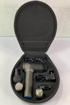 Snode Vibration Massage Device, Six Attachments, Charger. Comes in branded case. Item has some wear marks with a small crack on plastic badge. Pre-owned.