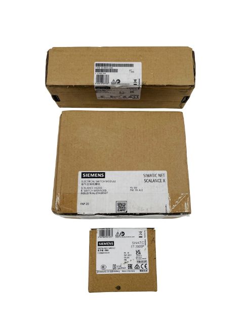 Three Siemens Simatic items; 6GK5208-0BA00-2TB2 Switch Module, 6ES7 141-6BH00-0AB0 Digital Input Module & 6ES7136-6BA01-0CA0 Digital Input Module (All items as new, boxes open).