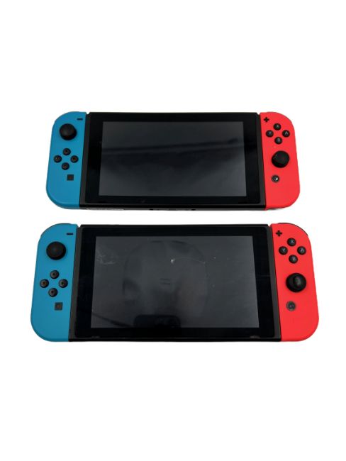 Two pre-owned Nintendo Switch consoles sold for parts (1 x damaged charging port, cosmetic damage to screen. 1 x Left hand Joy-con is not detected) (Sold as seen for parts only).