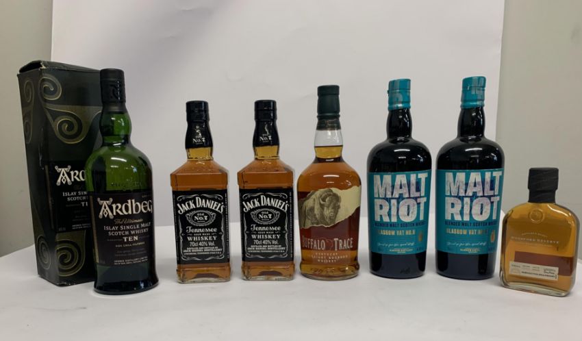 Two Jack Daniel's Old No.7 Tennessee Sour Mash Whiskey 2 x 700ml, Two Malt Riot Blended Malt Scotch Whisky 2 x 700ml, Buffalo Trace Kentucky Straight Bourbon Whiskey 700ml, Woodford Reserve Whiskey 200ml, Ardbeg Islay Single Malt Scotch Whisky 10 Year Old.